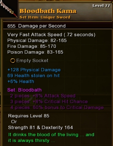 | Very Fast Attack Speed (.72 seconds) Physical Damage: 82-165 Fire Damage: 85-170 Poison Damage: 83-165 |