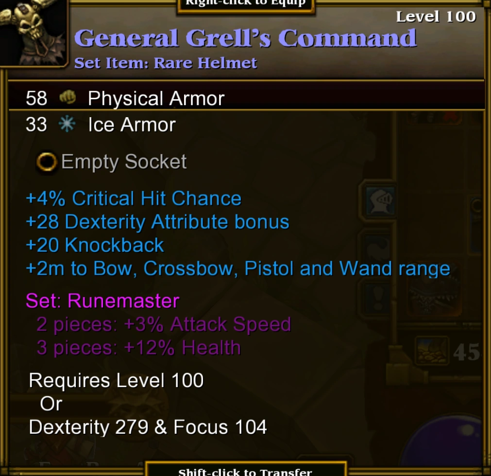 Runemaster is a collection of Torchlight II armor with set bonuses. All pieces come in rare quality and have an item level of 7 and a level requirement of 3.