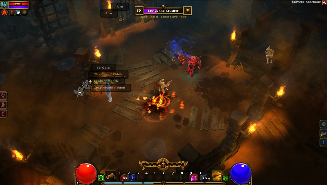 Slavers' Stockade is a small dungeon in Act I, accessed through a building in the Slavers' Camp area of Frosted Hills. It has fixed layout. The boss, Kidrik the Mauler holds the Passkey Ember needed for the quest The Ember Keys.