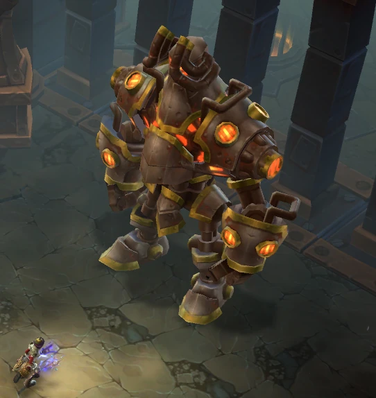 The War Titan, also known as the Killbot, is the act boss of act 3, found at the end of the Emberworks. It is a massive humanoid robot, standing several times the player's height. The Titan stands dormant until the player approaches, then awakens and attacks. Its homing missile strikes do a lot of damage, but the player can use the numerous statues for cover (until they're shattered by the blasts). After defeating the War Titan, the gate it guards will open, allowing the player to access the machinery to recharge the Power Source.
